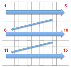 Eine Aufnahmeserie für ein Giga-Pano mit 700 Bildern kann bis zu einer Stunde dauern. Im Normalfall werden die Aufnahmen zeilenweise von links oben nach rechts unten aufgenommen.