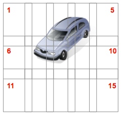 Das Auto steht so im Aufnahmebereich, dass es in den Aufnahmen der Zeile 1 (Bilder 1-5) und der Zeile 2 (Bilder 6-10) abgebildet wird.